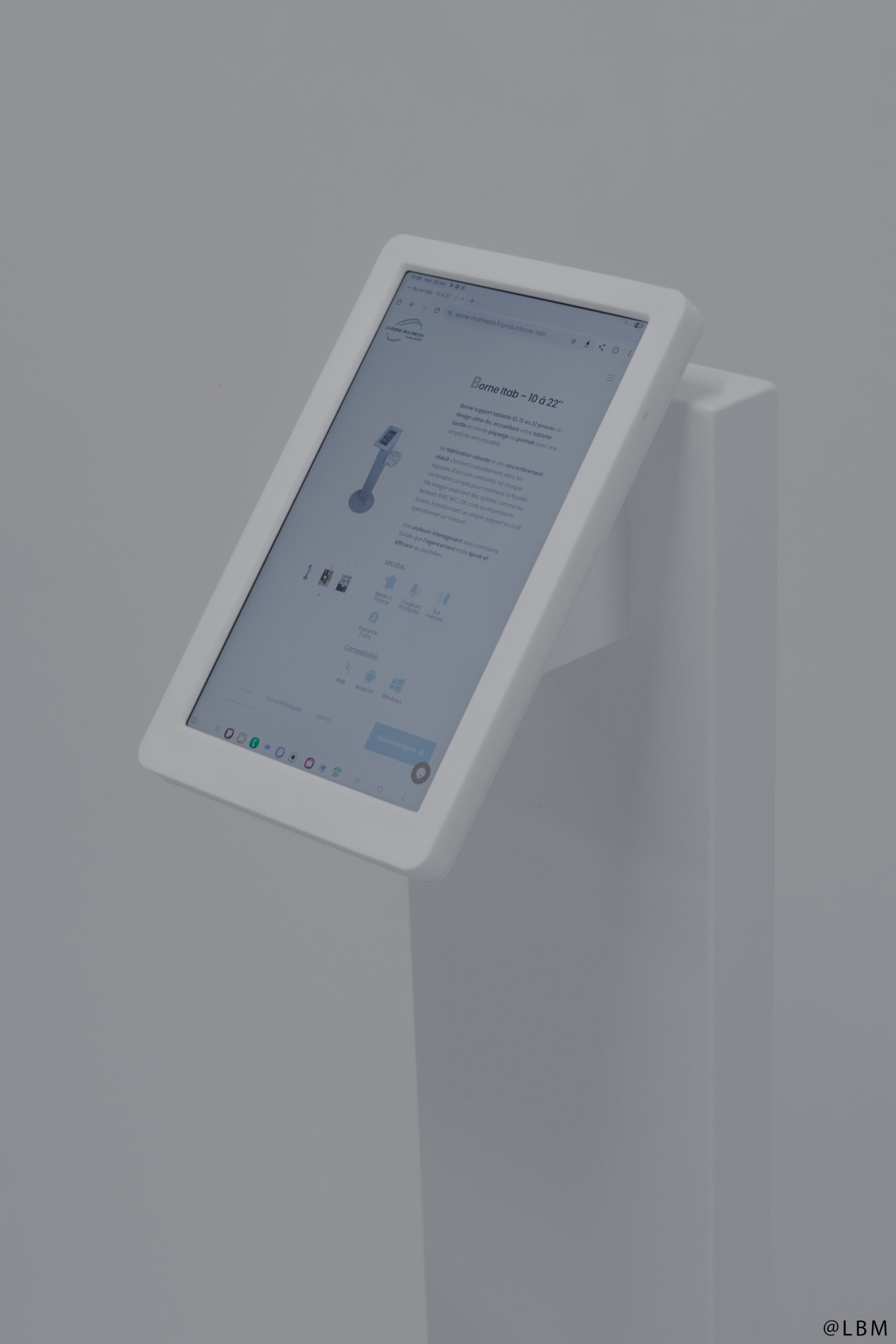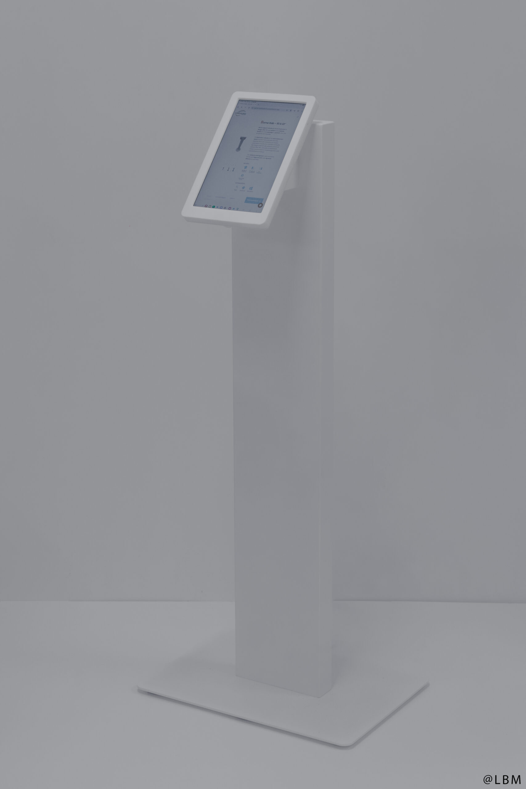 Borne support tablette 10, 15 ou 22 pouces au design ultra-fin, accueillant votre tablette tactile en mode paysage ou portrait avec une simplicité remarquable.